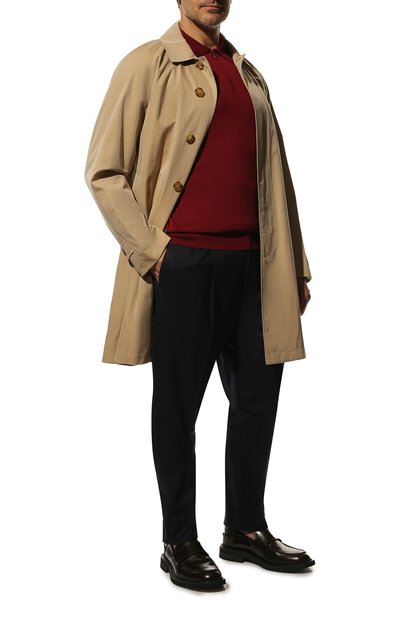 Темно-синим брюкам с двойными защипами спереди добавили спортивное звучание с помощью широкого эластичного пояса-кулиски, как у джоггеров. Для пошива модели использовали мягкую тонкую шерсть, поддерживающую оптимальный микроклимат. Наши стилисты предлагают создать повседневный образ с поло и кроссовками.