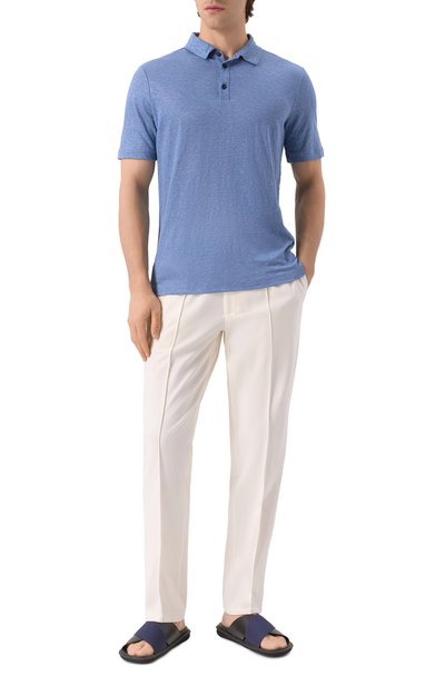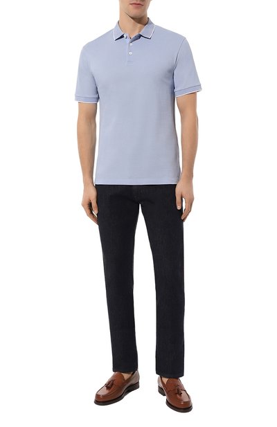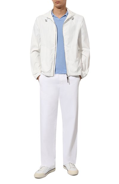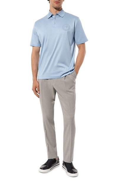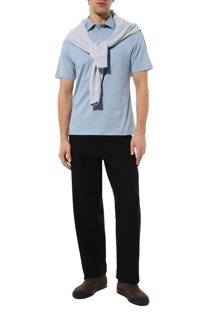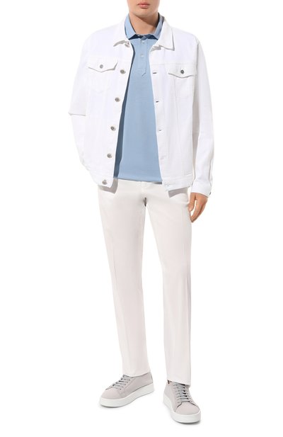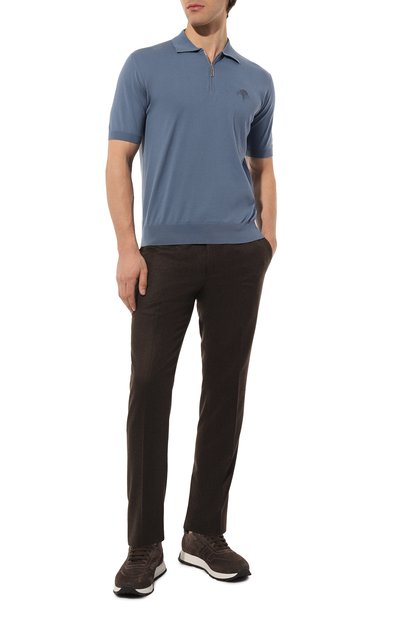 В производстве небесно-голубого поло итальянские мастера использовали мягкое легкое пике с характерным сотовым переплетением нитей. Шелковистый материал на основе длинноволокнистого хлопка не мнется и хорошо пропускает воздух, сохраняя оптимальный микроклимат. О принадлежности бренду, основанному Брунелло Кучинелли, сообщает вышитая спереди эмблема в виде герба Соломео.