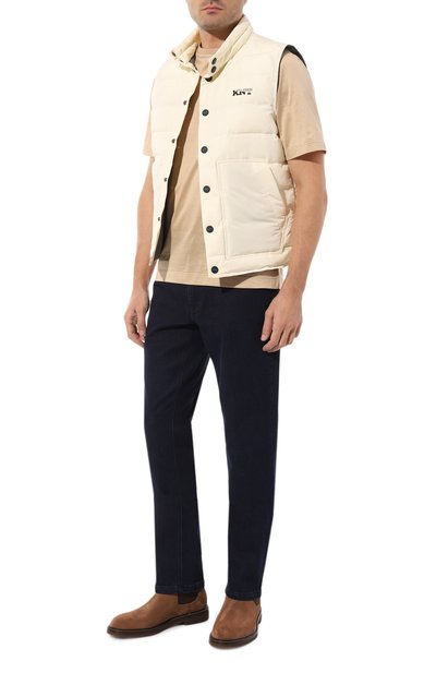 Тонкий кремовый жилет станет идеальным дополнением повседневных образов в прохладную погоду. Ощущение комфорта сохранят плотный, но легкий лен с выразительной фактурой, похожей на деним, и слой гусиного пуха внутри горизонтальных камер. Модель с воротником-стойкой и тремя карманами застегивается на металлические кнопки с выгравированным логотипом бренда, основанного Брунелло Кучинелли.