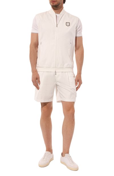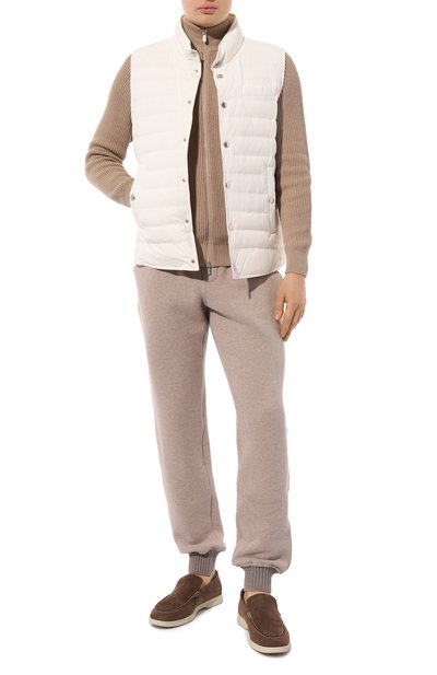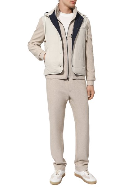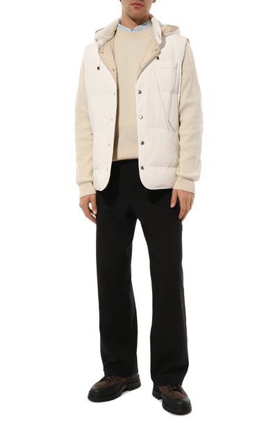 Тонкий кремовый жилет станет идеальным дополнением повседневных образов в прохладную погоду. Ощущение комфорта сохранят плотный, но легкий лен с выразительной фактурой, похожей на деним, и слой гусиного пуха внутри горизонтальных камер. Модель с воротником-стойкой и тремя карманами застегив ается на металлические кнопки с выгравированным логотипом бренда, основанного Брунелло Кучинелли.