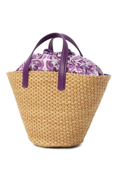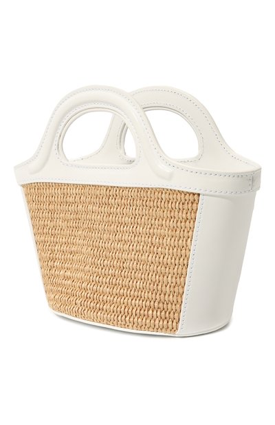 Гладкая кожа на этой черной мини-сумке соседствует с плетением из блестящих текстильных шнуров, стилизованных под соломку. Фактурный материал на передней панели украсили контрастной вышивкой в виде крупного логотипа бренда, а красной версией фирменной символики дополнили внутреннюю от делку из твила. В комплекте – съемный плечевой ремень.