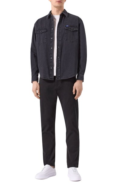 Темно-серую рубашку с треугольными кокетками выполнили из легкого денима Tencel Lyocell, сырье для которого получили из древесины лесов с ответственным управлением. При производстве материала повторно использовали 99% воды и растворителей. Лазерная обработка готового изделия придала ему деликатный выбеленный эффект.