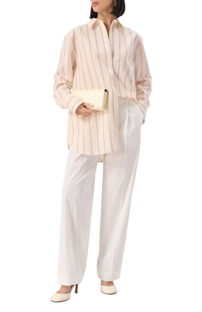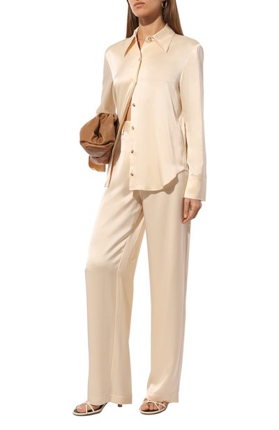 Лаконичные молочно-белые брюки изготовили из тонкого струящегося текстиля, благодаря чему изделие с боковыми карманами и широким эластичным поясом комфортно садится по фигуре. Наши стилисты поддержали модель свободного кроя темно-синим костюмным жилетом на голое тело и черными балетками с акцентным квадратным мысом.