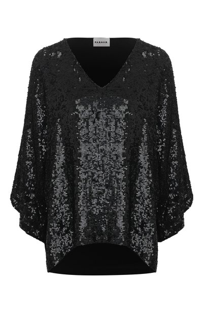 Черная свободная блуза с V-образной горловиной сделает образ для светского мероприятия особенно эффектным. Модель с объемными укороченными рукавами выполнили из легкой прочной вискозы, плотно расшитой глянцевыми пайетками. Чтобы усилить блеск декора, предлагаем сочетать изделие с парной юбкой.