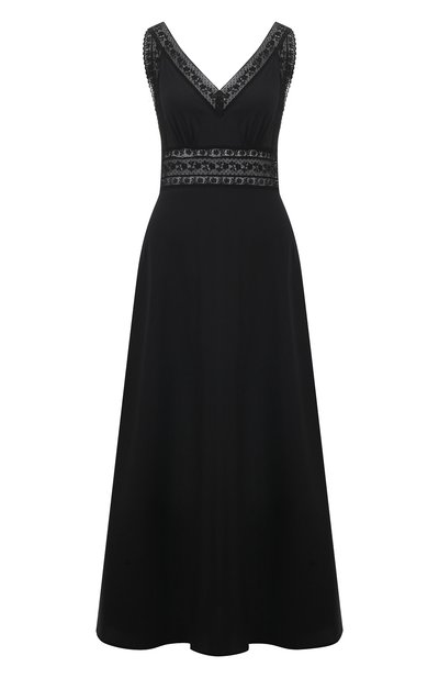 Это черное платье без рукавов может стать эффектной основой коктейльного образа, достаточно встать на высокие каблуки и взять в руки клатч. Модель с полупрозрачными кружевными вставками, подчеркивающими V-образные вырезы и талию, сшили из нежного струящегося шелка, ниспадающего мягкими широкими складками.