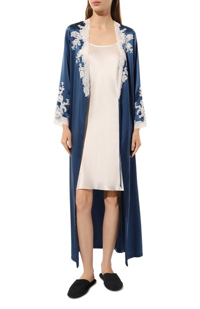 Сорочку выполнили из хлопкового гладкого текстиля с деликатным блеском. Модель с узкими регулируемыми бретелями декорировали широкой кружевной вставкой по низу.