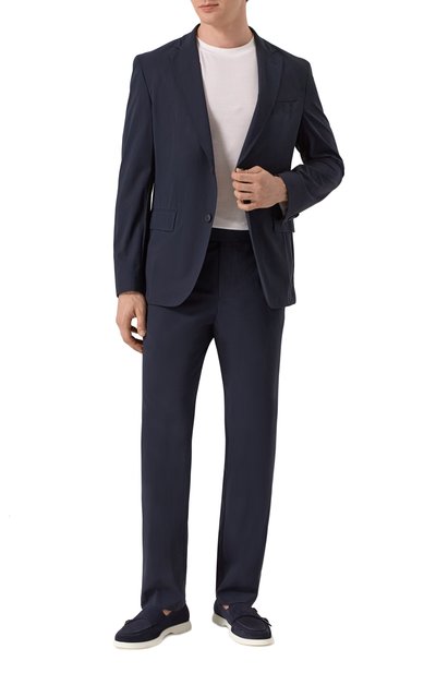 Черный приталенный костюм станет идеальным дополнением гардероба. Однобортный пиджак с узкими лацканами и брюки со стрелками изготовили из тонкой легкой шерсти первого пострига: материал укрепили полиэстером и эластаном, поэтому изделия комфортно садятся по фигуре и долго сохраняют безупречный вид. Принадлежность комплекта бренду обозначили фирменной красной нашивкой на левом рукаве.