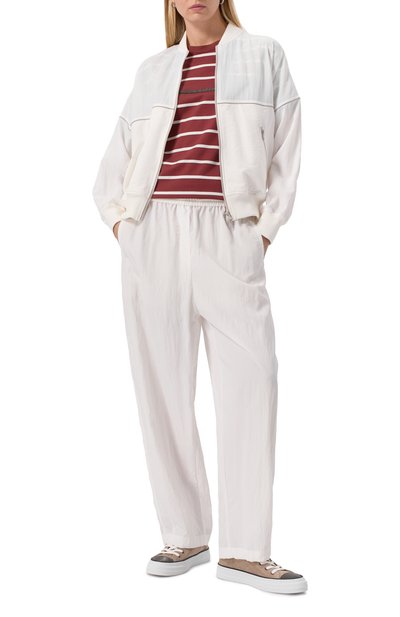Бежевую футболку в узкую горизонтальную полоску украсили миниатюрной пластиной с выгравированным логотипом, которую поддержали контрастной нашивкой с яркой литерой K сзади. Для пошива модели использовали нежное джерси из отборного тщательно очищенного хлопка, обеспечивающего комфортный микроклимат. Изделие исключительно приятно ощущается на коже и не ограничивает движения.