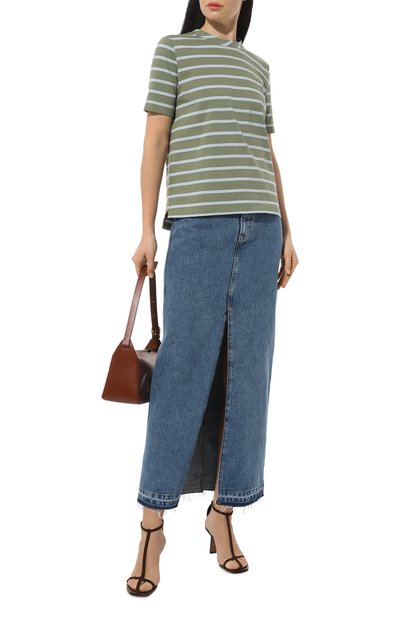 Бежевую футболку в узкую горизонтальную полоску украсили миниатюрной пластиной с выгравированным логотипом, которую поддержали контрастной нашивкой с яркой литерой K сзади. Для пошива модели использовали нежное джерси из отборного тщательно очищенного хлопка, обеспечивающего комфортный микроклимат. Изделие исключитель но приятно ощущается на коже и не ограничивает движения.
