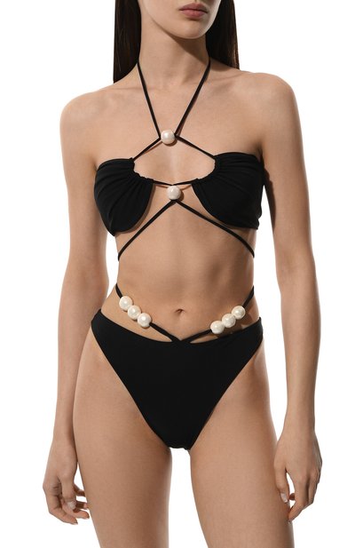 Для изготовления черных плавок использовали шелковистый гладкий текстиль на основе нейлона и эластана. Материал с таким составом быстро сохнет и хорошо тянется, удобно облегая фигуру. По бокам модель дополнили длинными переплетенными шнурами.