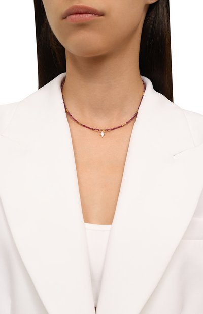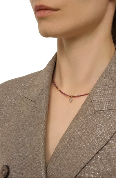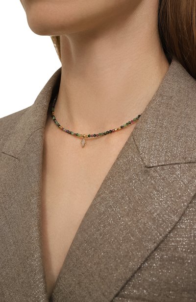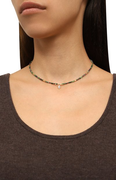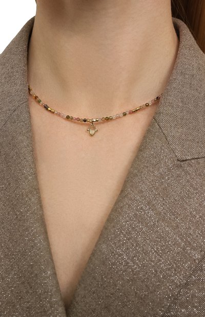 Для изготовления колье использовали зеленый апатит. Полупрозрачные бусины из этого минерала чередовали со вставками из позолоченного ювелирного сплава. Из такого же легкого металла выполнили небольшую подвеску с лунным камнем и застежку-карабин.