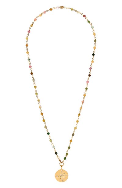 Разноцветное колье выполнили из турмалина нескольких оттенков. Небольшие ограненные бусины соединили друг с другом миниатюрными звеньями из ювелирного сплава с гальваническим покрытием золотом. Такой же материал использовали для изготовления подвески неправильной круглой формы. Эту деталь разместили в центре украшения, подчеркнув ее фактурным узором и вставками из кубического циркония.