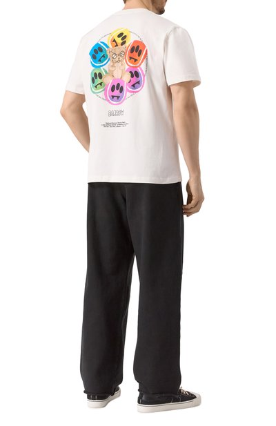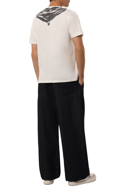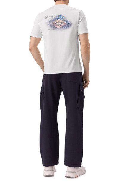 Для пошива белой футболки использовали мягкий тонкий хлопок, который не ограничивает свободу движений и хорошо пропускает воздух. Спереди модель украсили миниатюрным черным логотипом бренда, а сзади — крупным принтом в виде капюшона с фирменными линзами. Этот узор выполнили так, что он визуально выглядит о бъемно.