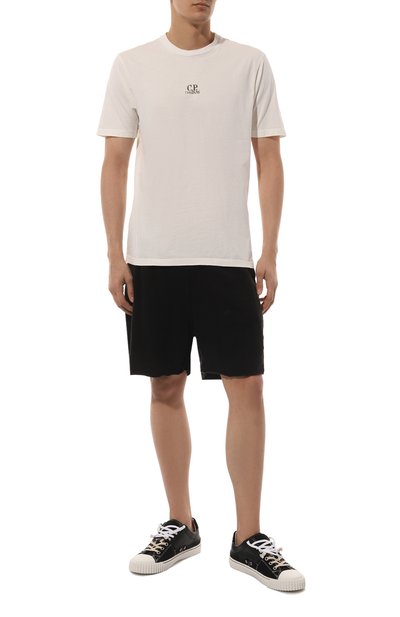 Для пошива белой футболки использовали мягкий тонкий хлопок, который не ограничивает свободу движений и хорошо пропускает воздух. Спереди модель украсили миниатюрным черным логотипом бренда, а сзади — крупным принтом в виде капюшона с фирменными линзами. Этот узор выполнили так, что он визуально выглядит объемно.