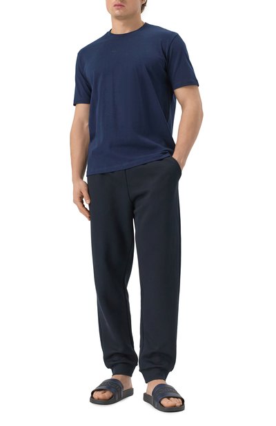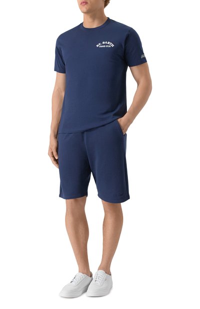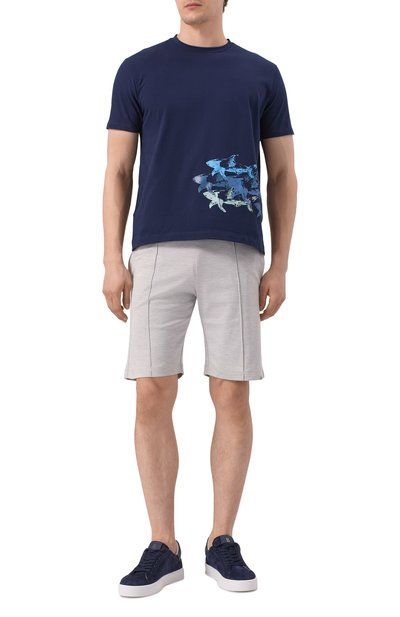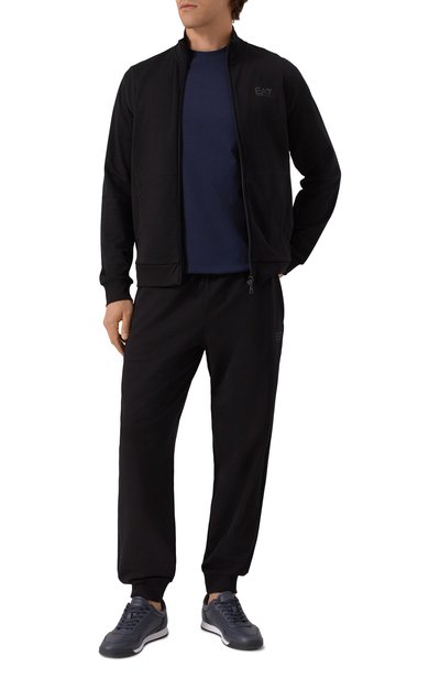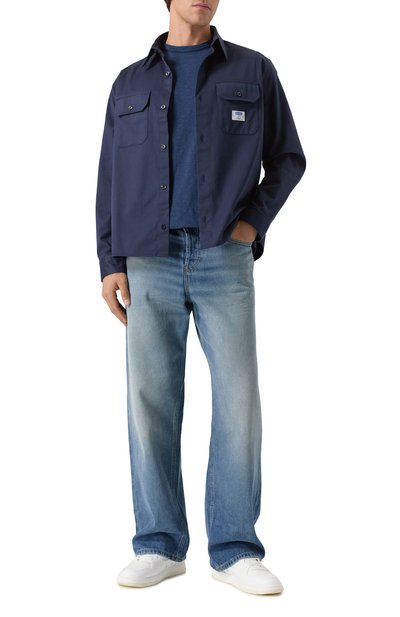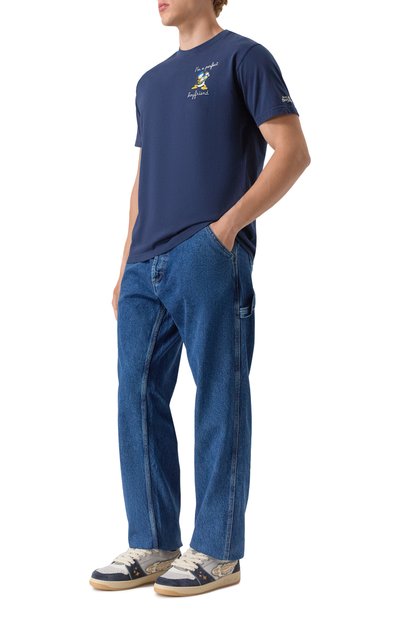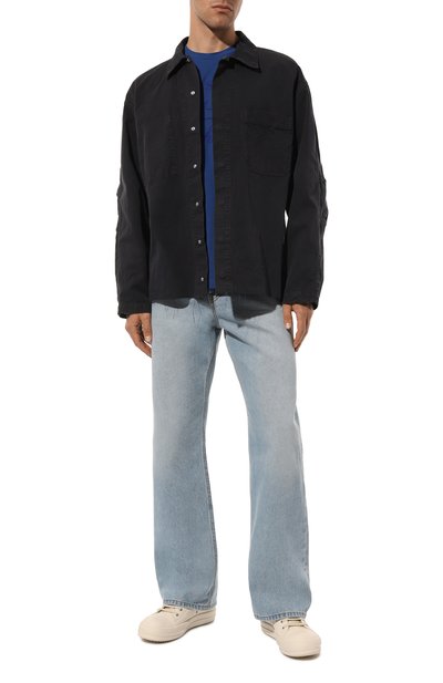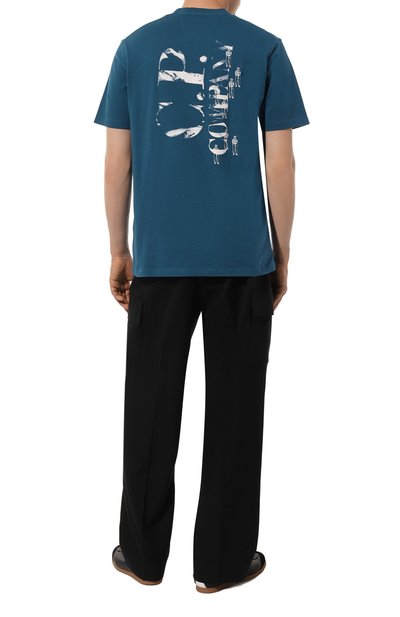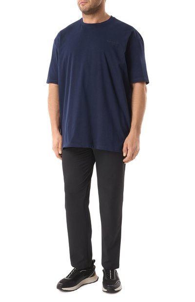 Синюю футболку с небольшим логотипом спереди украсили черным принтом, имитирующим капюшон с фирменными линзами. Для пошива модели с короткими рукавами использовали мягкое джерси из отборного хлопка, которое хорошо пропускает воздух, поддерживая оптимальный микроклимат, и сохраняет свободу движений.