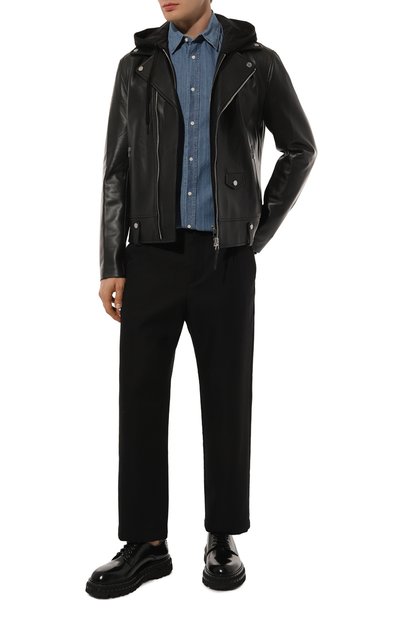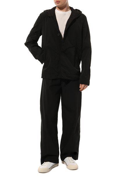 Укороченную черную куртку сшили из хлопкового материала Hydro Stop Tela. Плотное переплетение нитей особого кручения делает текстиль прочным, непродуваемым и непромокаемым, а дополнительную защиту от дождя и ветра обеспечивает капюшон, спрятанный в воротнике-стойке. На накладном диагональном кармане спереди модель украсили патчем с логотипом, созданным при помощи лазера.
