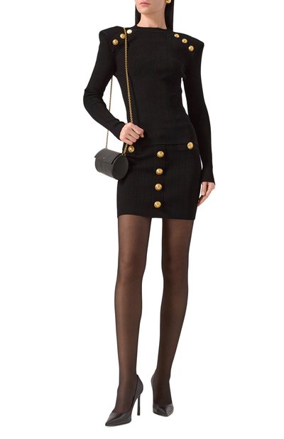 Короткая юбка демонстрирует свое происхождение двумя рядами фирменных пуговиц с гравировкой Signature Lion. Симметрично расположенный золотистый декор в тандеме с ромбовидным узором на мягком вискозном трикотаже тонкой вязки визуально моделирует фигуру. Сырье для материала получили из возобновляемых лесов.