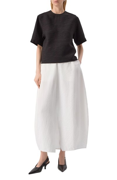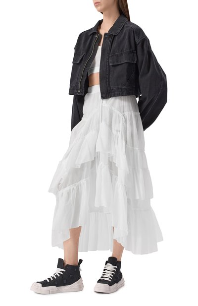 Романтичность белой макси-юбки с ажурным узором, вышитым в технике ришелье, усилили широким расклешенным воланом. Для пошива модели использовали тонкую прочную хлопковую ткань, которая хорошо пропускает воздух и не мнется. Чтобы облегающее изделие не сковывало движения, его дополнили гофрированными эластичными вставками по бокам.