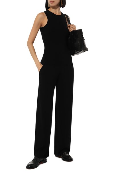 Лаконичный черный топ без рукавов будет уместен как в непринужденных повседневных, так и в более сдержанных casual-образах. Модель выполнили из фактурного эластичного трикотажа на основе мягкой шелковистой вискозы. Такой материал хорошо пропускает воздух, а изделие из него садится точно по фигуре, не сковывает движения и не теряет форму со временем.