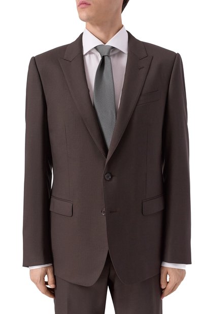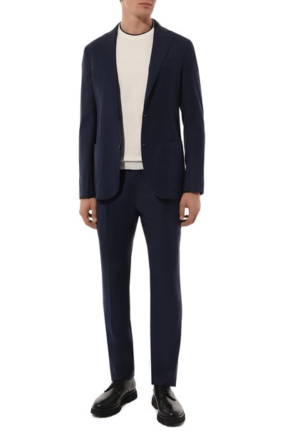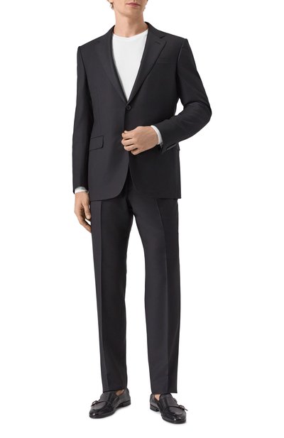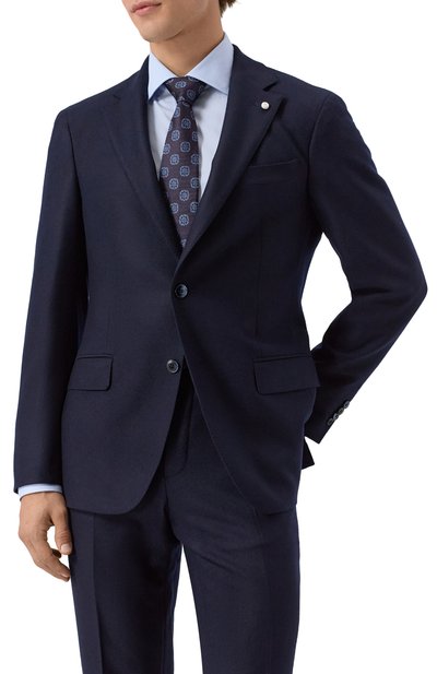 Темно-синий костюм в узкую меловую полоску днем будет уместно смотреться в офисе, вечером — в пабе. Для его изготовления использовали тонкую мягкую шерсть с добавлением легкого прочного кашемира. Края деталей вручную прошили стежками пунто, поэтому однобортный пиджак с широкими лацканами и брюки со стрелками идеально держат форму и не вытягиваются со временем.