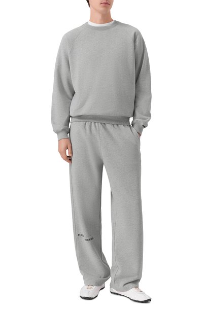 В меланжево-сером свитшоте со спущенной линией плеч будет комфортно в прохладную погоду. Модель из мягкого хлопкового трикотажа с плотным плетением хорошо сохраняет тепло и защищает от небольшого ветра. Спереди изделие декорировали миниатюрной кожаной эмблемой, сзади – логотипом.