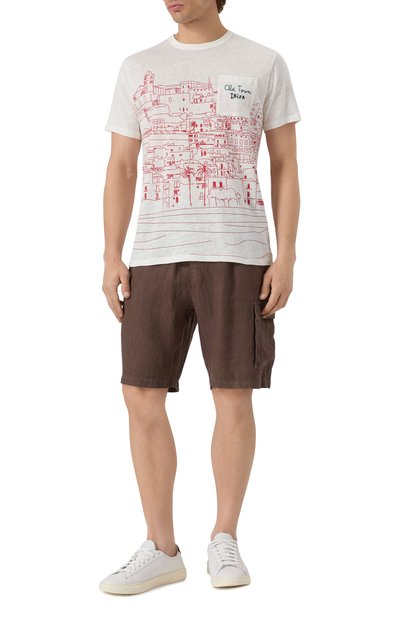 Свободные шорты сшили из тонкого льна с характерной фактурой. Широкий эластичный пояс дополнили кулиской. Изделие окрасили в готовом виде, добившись будто немного выцветшего оттенка.