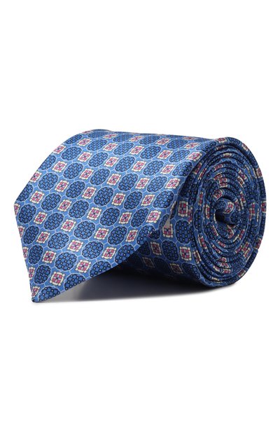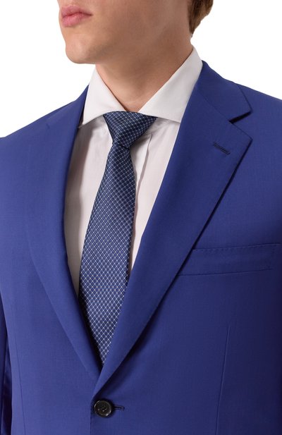 Синий галстук с фуляровым паттерном сшили из гладкого прочного шелка с характерным блеском. Аксессуар легко драпируется в скульптурный узел, хорошо держит форму и расправляется без заломов. Эластичный шов сзади не дает модели деформироваться.