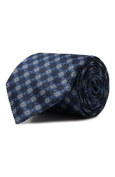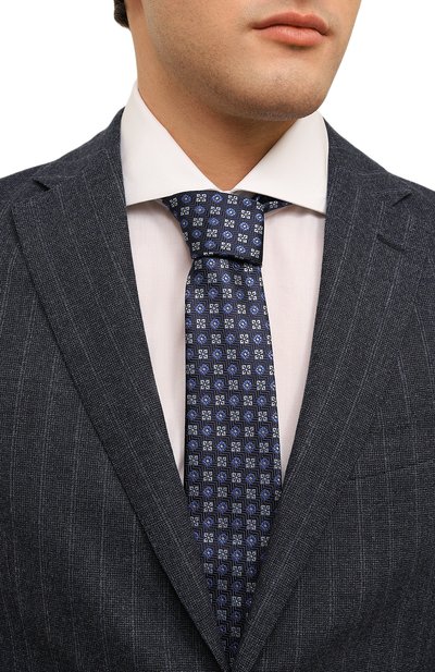 Темно-синий галстук с деликатным блеском, придающим жаккардовому паттерну визуальный объем, изготовили из прочного шелка. Широкий аксессуар легко драпируется, формируя скульптурный узел, не вытягивается и быстро расправляется без заломов.