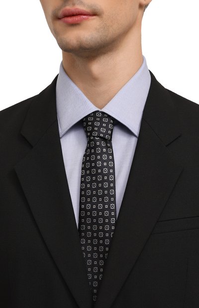 Для создания черного широкого галстука использовали прочный фактурный шелк, который хорошо держит узел и быстро восстанавливает форму после развязывания. Аксессуар с ненавязчивым цветочным паттерном в оттенках синего не снизи т строгость формального образа.