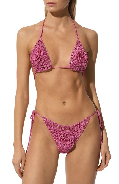Под солнечными лучами розовый купальник станет еще ярче: треугольные чашечки и переднюю часть плавок-бикини украсили аппликацией из сверкающих кристаллов. Для пошива использовали мягкую шелковистую микрофибру. Эластичный материал из переработанного нейлона б ыстро сохнет и не вытягивается. Посадка регулируется узкими завязками.