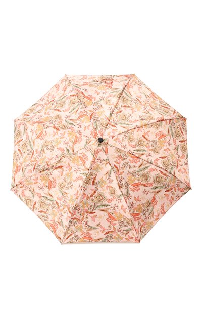 Для изготовления кремового зонта с разноцветным растительным мотивом использовали прочный шелковистый полиэстер, который быстро сохнет и долго не теряет яркие краски. Аксессуар открывается и компактно складывается при помощи кнопок. Рифленую ручку из золотистого металла декорировали сверкающими кристаллами.