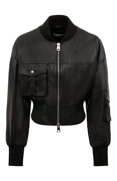 Черный укороченный бомбер с широким поясом из рифленого трикотажа сформирует приталенный силуэт «песочные часы». Для пошива модели с накладными карманами спереди и на левом рукаве использовали гладкую кожу с деликатным блеском. Тонкая выделка сделала материал мягким и эластичным, поэтому куртка комфортно садится по фигуре и не ограничивает движения.