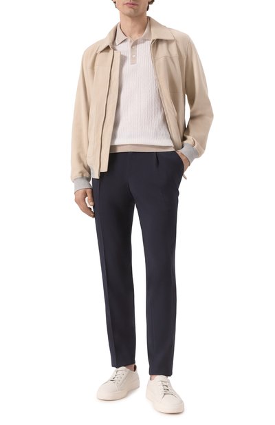 Пояс с кулиской и эластичной вставкой сзади снизил строгость этих формальных брюк и сделал их более комфортными. Зауженный крой со стрелками и темно-синий костюмный твил остались неизменными, поэтому модель будет уместна в офисе в free friday. Тонкую ткань выполнили из шерсти ягнят, которых вырастили в условиях, близких к естественным, и остригли щадящими методами.