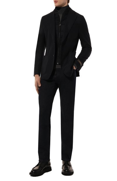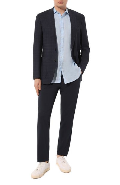 Однобортный пиджак Huge с двумя шлицами сшили из шерстяной саржи. Приталенную модель с тремя врезными карманами и широкими лацканами дополнили атласным подкладом из поливискозы.