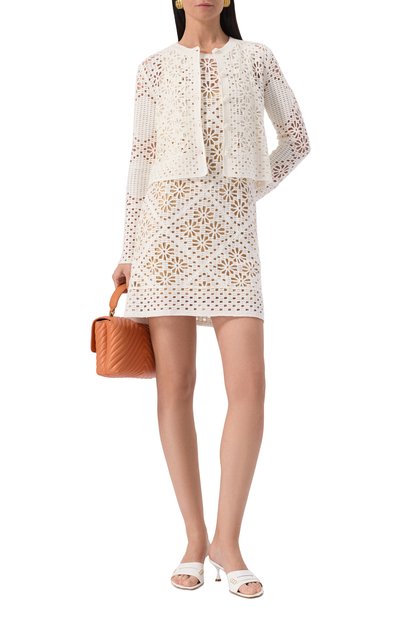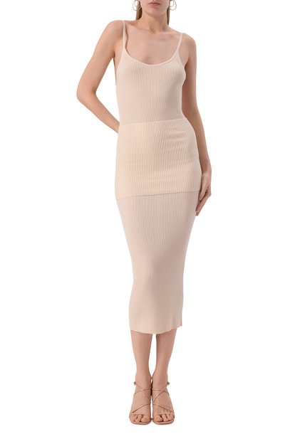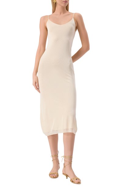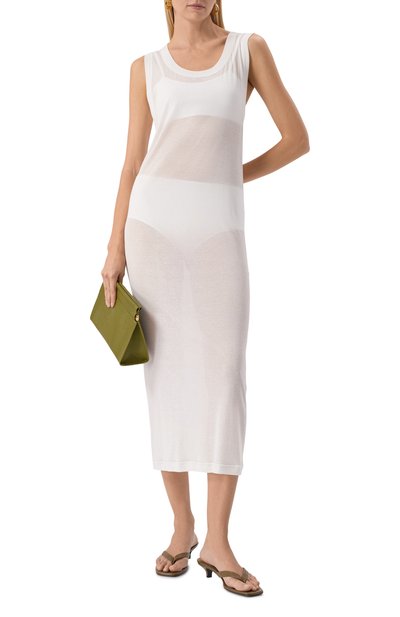Белое облегающее платье с узкими бретелями и Y-образной спинкой напоминает майку, удлиненную до середины голени. Для пошива модели использовали рифленый эластичный трикотаж из шелковистой вискозы, который приятно ощущается на коже и идеально пропускает воздух. Спереди — текстильный брендированный патч.