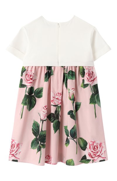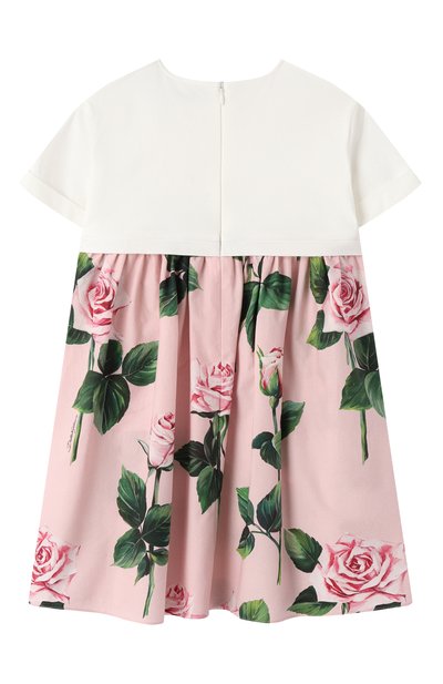 Платье стилизовали под комплект из белой футболки с короткими рукавами и расклешенной юбки. Для пошива модели использовали комбинацию нежного эластичного джерси и тонкого шелковистого поплина из отборного дышащего хлопка. Яркому цветочному принту на подоле вторит крупная знаковая монограмма DG на лифе спе реди. Изделие с круглым вырезом застегивается потайной молнией сзади.
