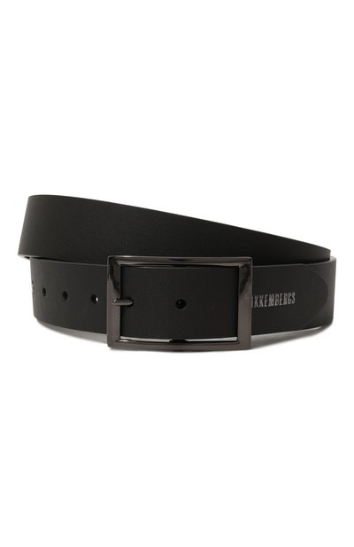Для изготовления черного ремня использовали плотную матовую кожу, отполированную до гладкости. Материал устойчив к появлению заломов и царапин, поэтому аксессуар будет долго выглядеть как новый. Модель застегивается лаконичной квадратной пряжкой с блестящим покрытием оттенка рутения, в тон которой – рельефный логотип на конце.