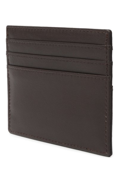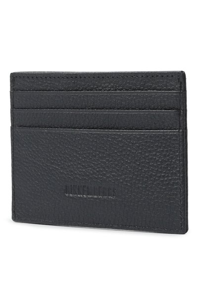 Футляр изготовили из зернистой кожи. Аксессуар с шестью слотами для карт и отделением для чеков украсили металлическим логотипом спереди и его тисненой копией сзади.