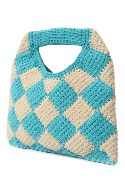 Красно-голубую сумку с клетчатым мотивом вручную связали в технике кроше из прочной акриловой пряжи, поэтому аксессуар не деформируется и не выцветет со временем. Модель с одной широкой ручкой украсили на передней панели небольшим кожаным патчем с логотипом. В основное отделение поместятся смартфо н, кошелек и носовой платок.