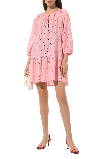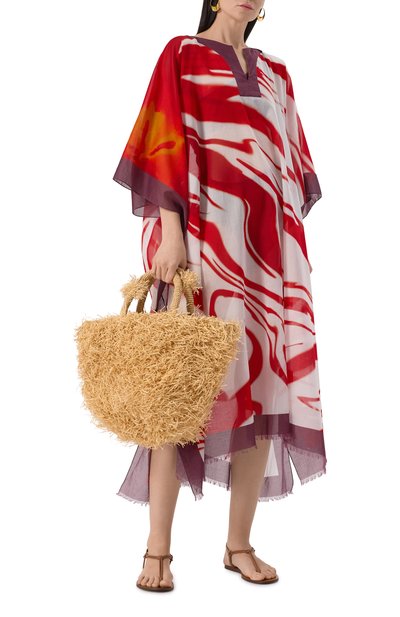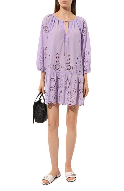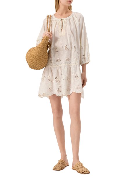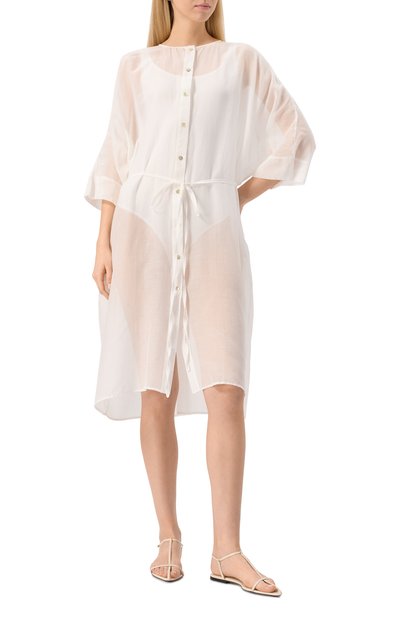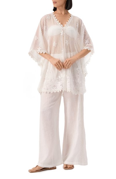 Для пошива свободной туники кремового оттенка использовали фактурную ткань из легкого дышащего льна с добавлением вискозы и нейлона для прочности. Материал сделали настолько тонким, что он получился полупрозрачным. Короткие рукава и асимметричный низ подчеркнули ажурным кружевом с растительным мотивом.
