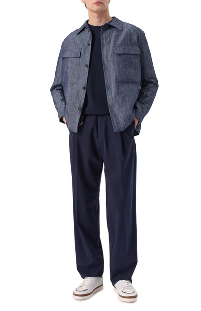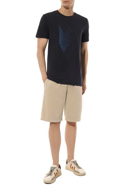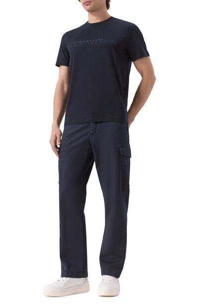 Создавая темно-синюю футболку с графичным принтом спереди, Серджо Корнелиани поставил ставку на материал. Для пошива модели использовали тонкое хлопковое джерси с добавлением эластана, отвечающего за прочность и безупречный вид надолго. Стирка с энзимами сделала трикотаж особенно нежным.