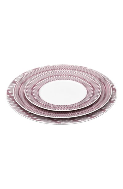 Широкие края обеденной тарелки покрыты ритмичным оранжево-розовым мотивом в пастельных тонах. Будто выполненный акварелью узор напоминает одновременно о выцветшей на солнце терракотовой плитке в старинных домах Марракеша и кирпичной кладке стен в Тулузе. Белоснежный центр изделия из тонкого, прочного и звонкого лиможского фарфора акцентирует внимание на поданном основном блюде.