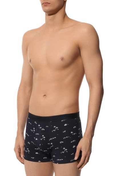 Для пошива темно-синих боксеров с геометричным цветочным узором использовали мягкое эластичное джерси: тонкий материал связали из длинноволокнистого хлопка пима, который сделал трикотаж особенно нежным и при этом исключительно прочным. Эластичный пояс украсили жаккардовым логотипом.