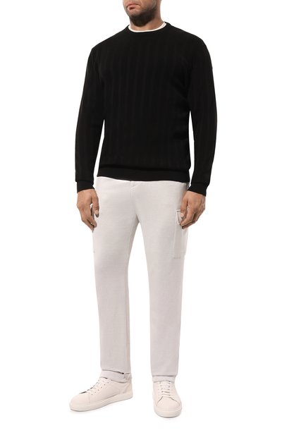 Серые брюки прилегающего силуэта сшили из эластичного хлопка, обеспечивающего свободу движений. В состав ткани добавили шелк, который делает изделие более приятным на ощупь, немнущимся и не подверженным пилингу. Такая модель будут уместна и в офисе, и на городских улицах. В комплекте — брелок с маской Пульчинеллы.