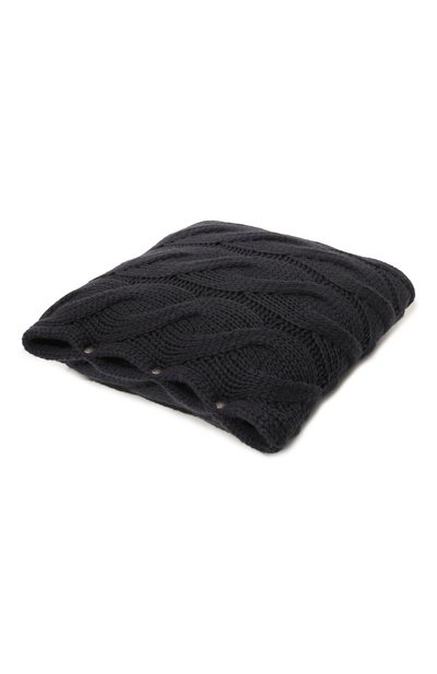На квадратную подушку из шелковистого купро с гипоаллергенным полиэстеровым наполнителем надели трикотажную наволочку с узором в виде кос. Ее связали из особенно мягкой и легкой кашемировой пряжи Piuma. С краю предусмотрели три металлические кнопки с выгравированным логотипом.