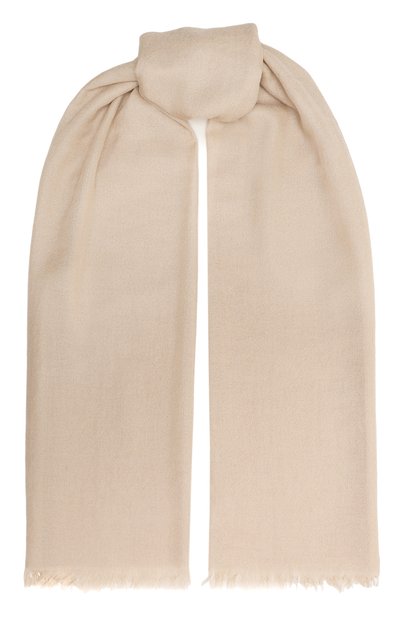 Бежевый однотонный шарф с короткой бахромой по краям выполнен из тонкого невесомого кашемира с добавлением гладкого прочного шелка. Лаконичный аксессуар, длины которого хватит, чтобы несколько раз обернуть шею или сформировать объемный узел, хорошо драпируется, не мнется и почти не ощущается на теле.