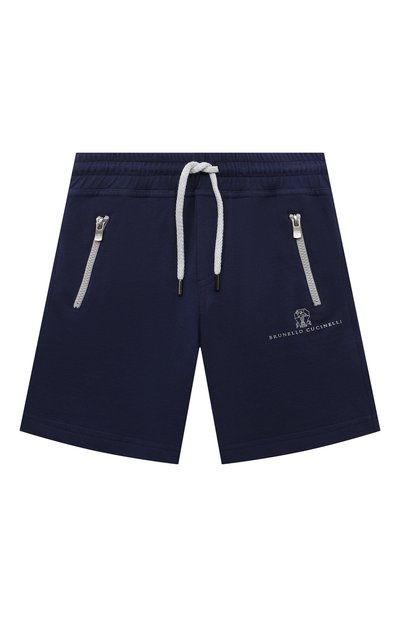 Для создания темно-синих шортов использовали мягких тонкий трикотаж из отборного хлопка, хорошо пропускающий воздух. Контрастный принт в виде логотипа и эмблемы зарифмовали с продетым в кулиску эластичного пояса шнуром, регулирующим посадку. Модель свободного кроя не ограничивает движения и приятно ощущается на коже.