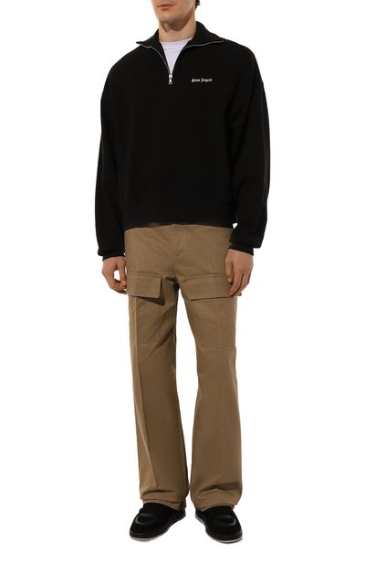 Черные кеды Area Lo изготовили из мягкой гладкой кожи с легким блеском. Этому материалу противопоставили бархатистую замшу, из которой выполнили фигурные накладки на мысе и заднике. Для отделки использовали плотный текстиль. Сбоку модель украсили небольшим золотистым логотипом бренда.