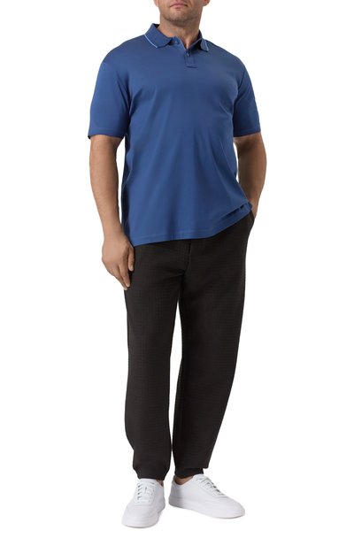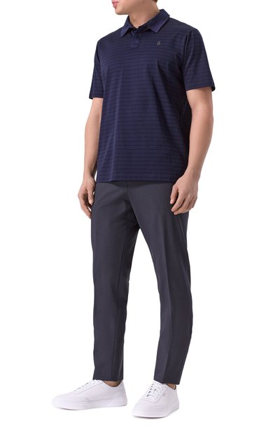 Лаконичное синее поло выполнили из легкого льна. Природные свойства лубяных волокон позволяют тонкому трикотажу хорошо пропускать воздух и быстро отводить влагу. Сырье обработали так, чтобы добиться особой мягкости. Предлагаем сочетать модель с черными брюками, дополнив образ коричневыми лоферами.