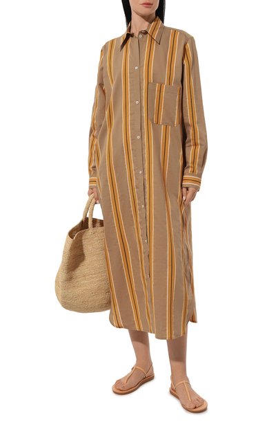 Светло-бежевое лаконичное миди-платье с длинными рукавами, дополненное двумя нагрудными карманами, идеально подойдет для прогулок в жаркие летние дни. Для пошива прямой модели с разрезами по бокам и регулируемой шнуровкой на декольте использовали приятный телу тонкий лен, который отлично пропускает воздух, быстро отводит влагу и слегка охлаждает кожу.